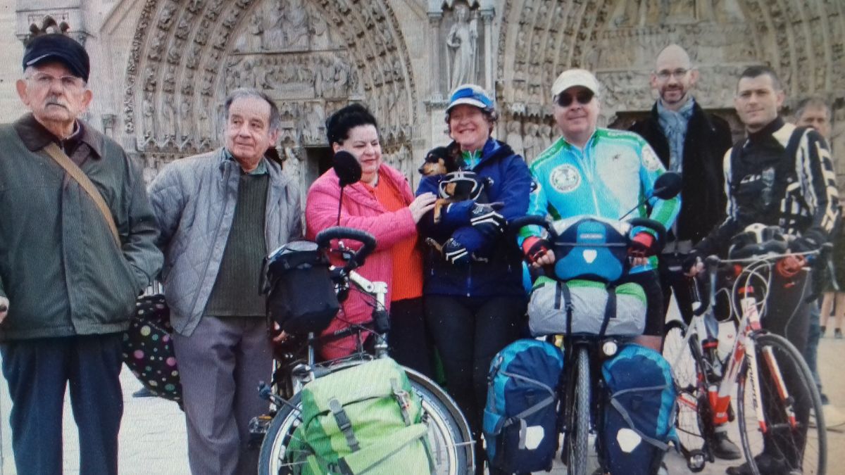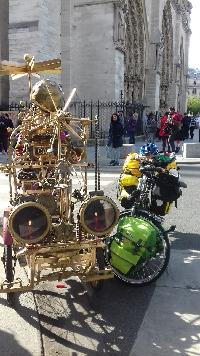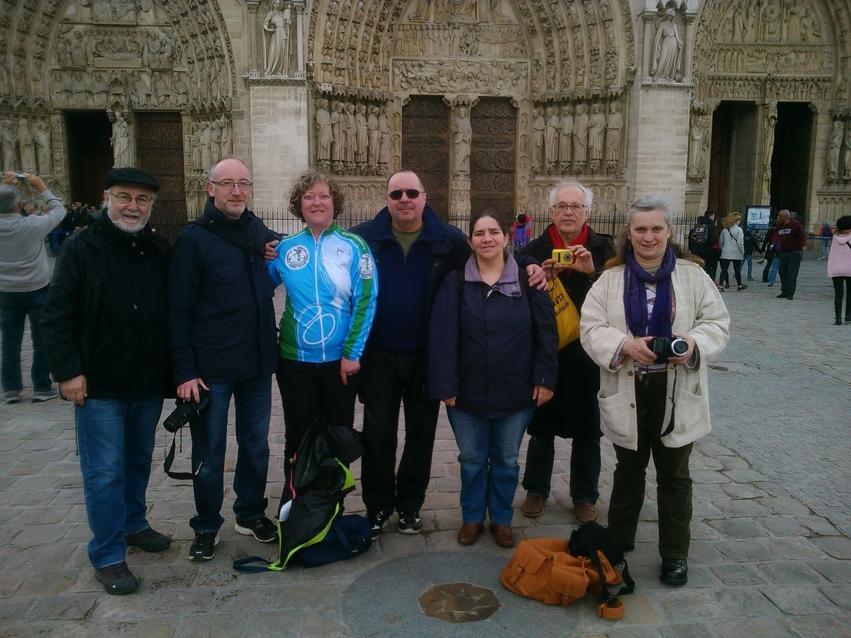 01/04/2017 - Paris : Avec de la famille, des amis et des espérantistes devant la cathédrale de Paris, à la borne qui marque le kilomètre zéro des routes de France. Nous sommes venus à pied et seule Rose a pris la peine de revêtir son maillot de vélo Espéranto, car, bien que nous soyons sencés partir ce 1er avril 2017, nous ne sommes pas prêts et devons reporter le vrai départ à demain. Mais considérant tout ce qui nous reste à faire, le serons-nous seulement demain ? Kun familiano, amiko kaj esperantistoj antaŭ la Pariza katedralo, ĉe la marko, kiu indikas la kilometron nulo de la Franciaj vojoj. Ni venis piede kaj nur Roz' zorgis survesti sia, biciklan ĉemizon Esperanto, ĉar, kvankan ni estas supozataj starti ĉi-tiun 1an de aprilo 2017, ni ne pretas kaj devas prokrasti la realan starton ĝis morgaŭ. Sed konsiderante ĉion, kio ankoraŭ estas por realigi, ĉu ni tamen ja pretos morgaŭ ? |