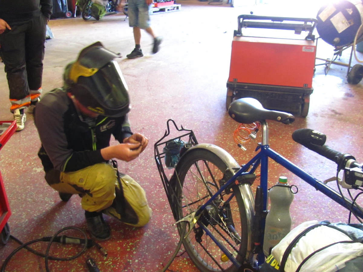 ![]() ![]() 06/07/2017 - Hoting : Un œillet tenant le porte-bagage arrière de Cyrille se romp à la jonction du hauban et de la base. L'avantage d'un cadre en acier est qu'il suffit de trouver de bons mécaniciens capables de le resouder et on se retrouve avec un vélo comme neuf, après application d'un peu d'antirouille et d'un coup de peinture. Rompiĝas ŝraŭbingo tenante la malantaŭan sakportilon de Cirilo, je la kuniĝo de la diagonala kaj horizontala forkoj. Avantaĝo de framo el ŝtalo estas la simpla neceso trovi bonajn mekanikistojn, kiuj kapablas reveldi ĝin. Post aplikigo de kontraŭrustaĵo kaj iomete da farbaĵo, oni retrovas preskaŭ novan biciklon. |
