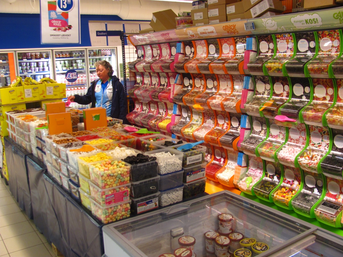 Norvegio : Les rayons de bonbons dans les supermarchés n'ont rien à envier à ceux de Suède. La pribombonaj sekcioj en superbazaroj neniel bezonas envii tiujn de Svedio. |