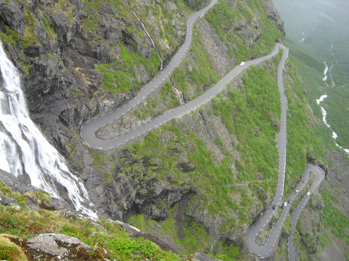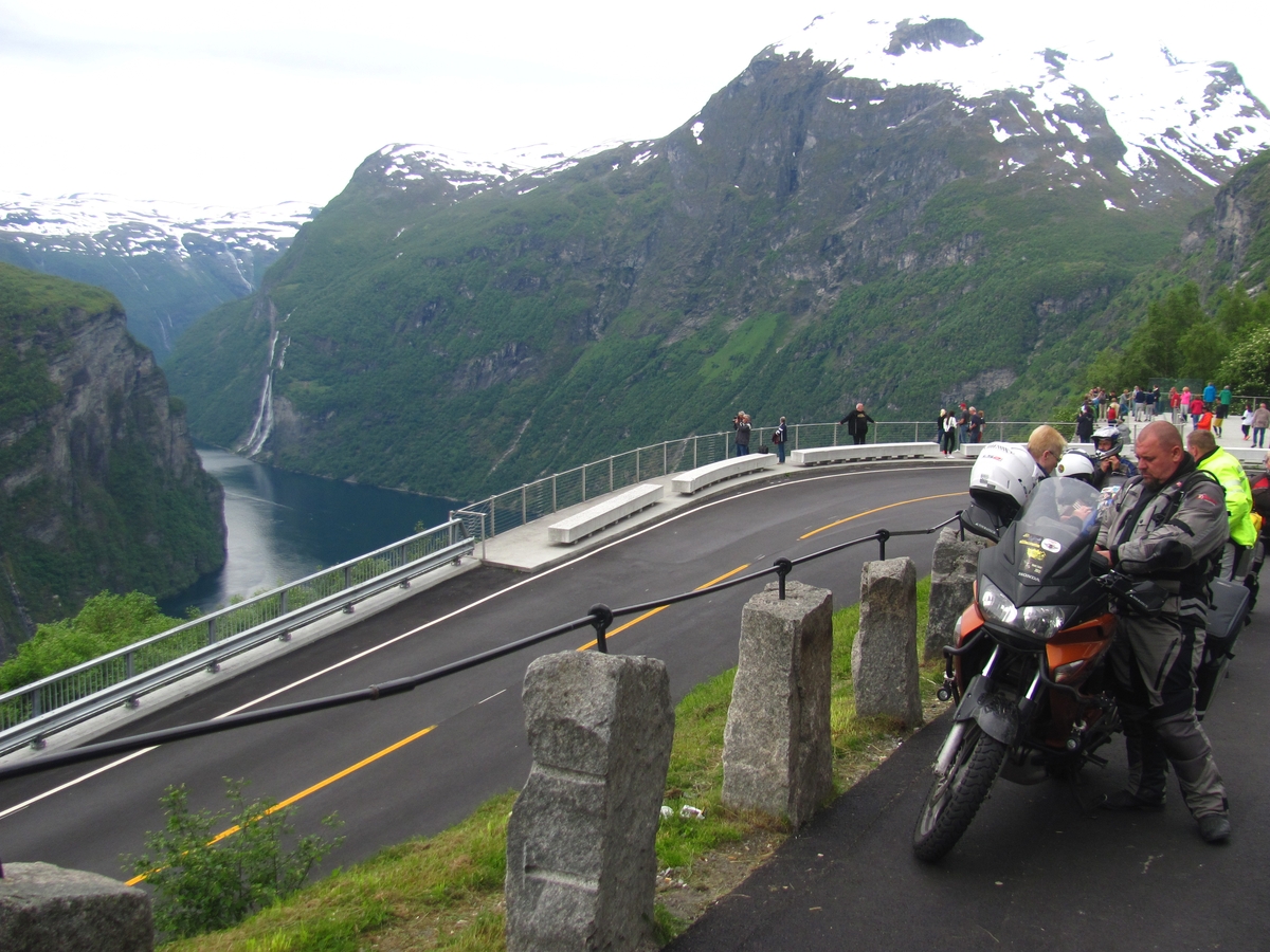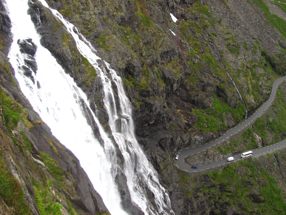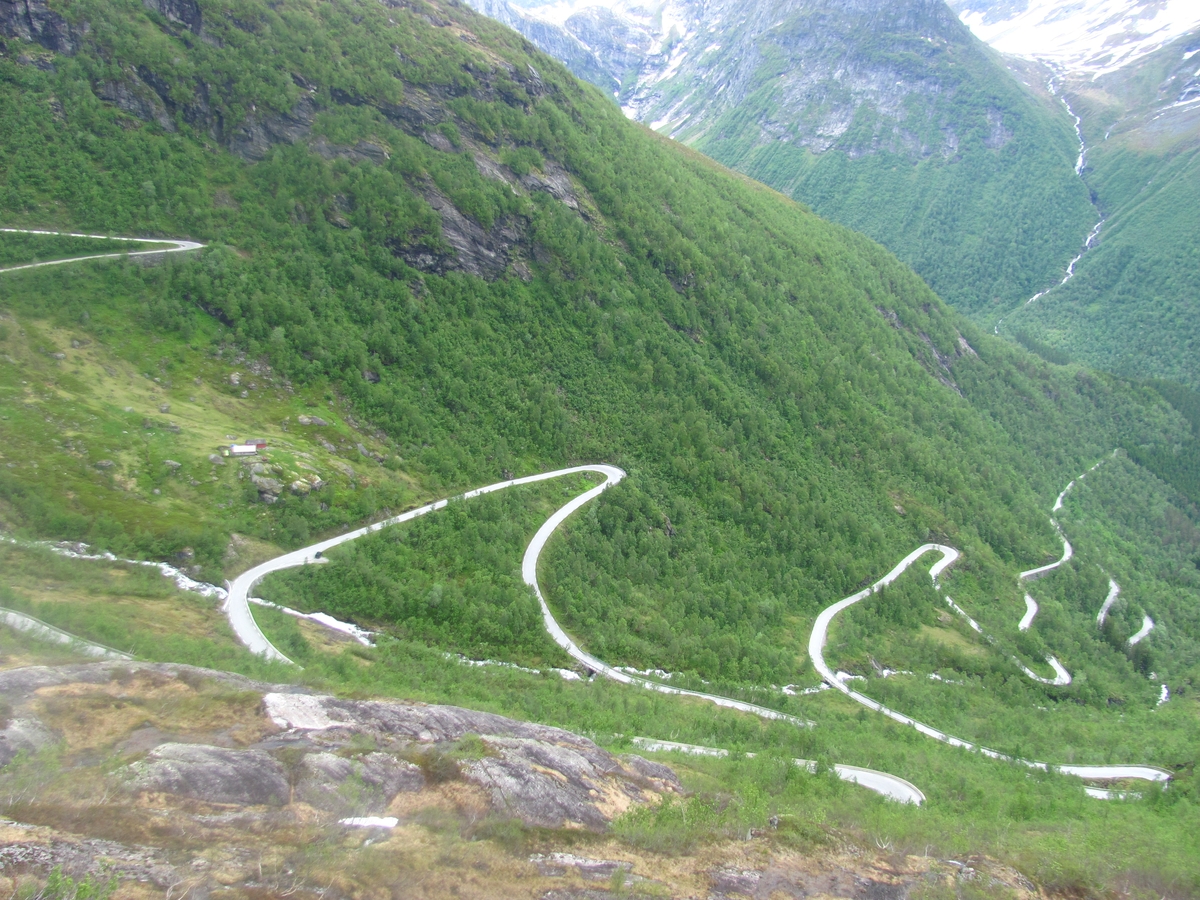 ![]() ![]() 17/06/2017 - En route / Survoje : Montée sur la Route des aigles, surplombant le fjord de Geiranger. Supren sur la Vojo de agloj, superstaranta la Geiranger-fjordon. |