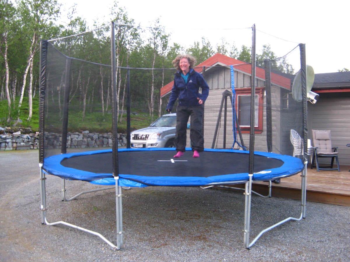Norvegio : Dans tous les pays nordiques, il y a un engouement pour le trampoline incompréhensible pour nous autres Français. On en trouve un dans pratiquement chaque jardin. En ĉiuj nordecaj landoj, oni ŝategas saltoretojn, kio estas nekomprenebla por ni francoj. Eblas vidi unu en preskaŭ ĉiu ĝardeno. |