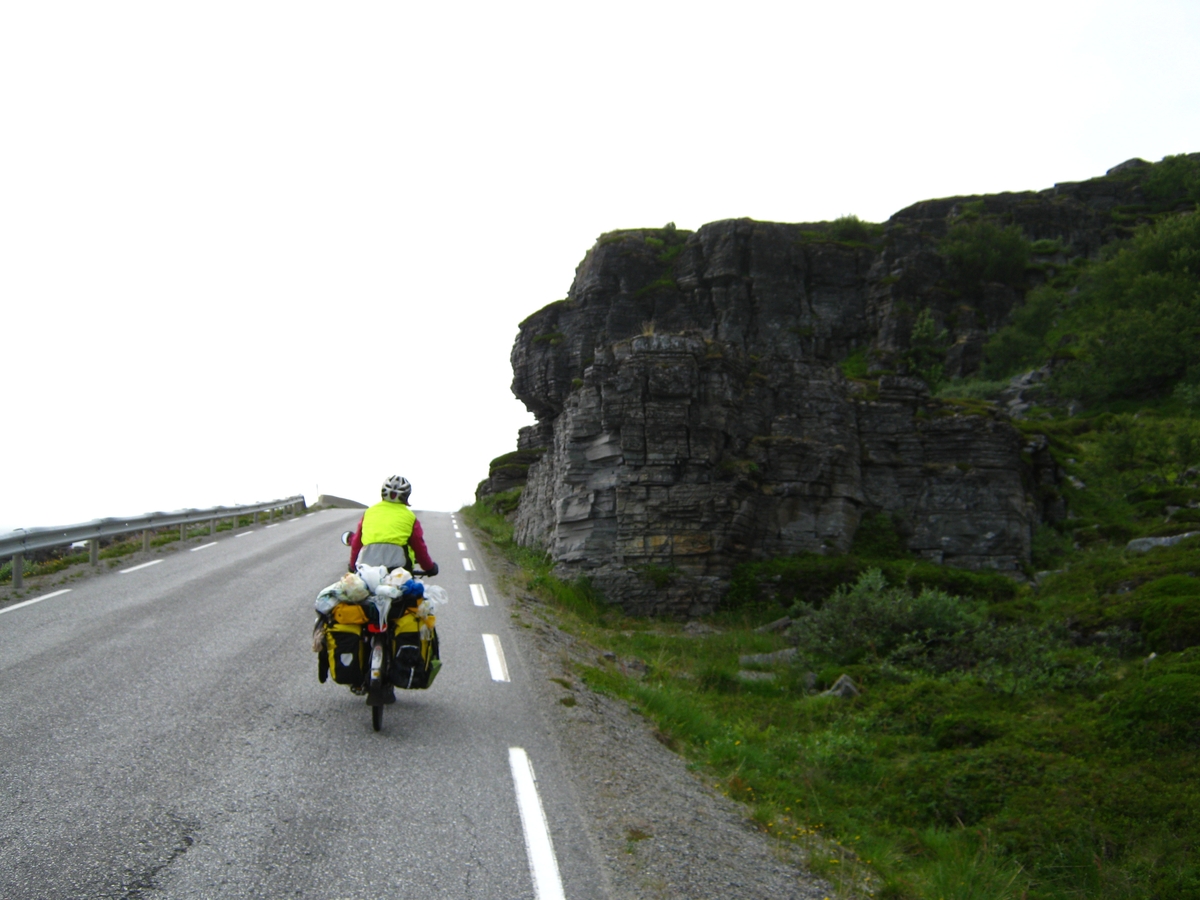 Survoje : Pour revenir du bout du monde, nous reprenons la même route qu'à l'aller, entre mer (dans le brouillard) et montagne. Por reveni de la mondekstremejo, ni rebiciklas sur la sama vojo kiel dum la alkabiĝo, inter maro (en nebulo) kaj montaro. |