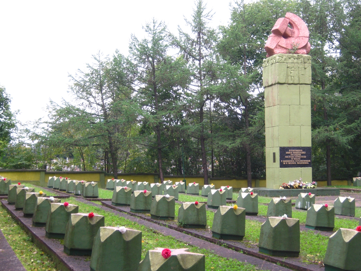 ![]() ![]() 14/09/2017 - Sokółka : Cimetière militaire soviétique. Chaque pierre tombale est en forme d'étoile avec une rose sur chacune. Milita tombejo sovtunia. Ĉiu tomba ŝtono je formo de stelo kun po unu rozo. |