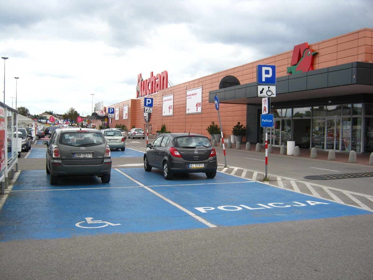 - Białystok : Sur le parking de ce supermarché, on trouve des places réservées pour les handicapés... et pour la police. Attention à ne pas confondre ! En la parkloko de tiu superbaearo, troveblas parklokoj poe handikapuloj... kaj por la polico. Atentu, ke vi ne konfuzu! |