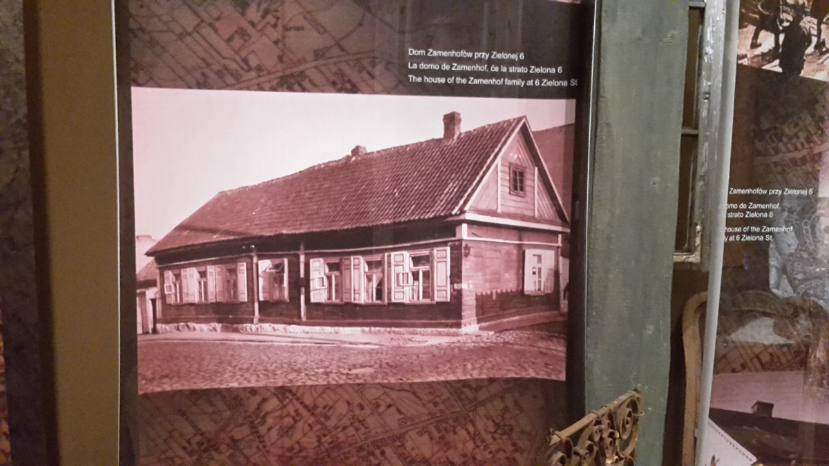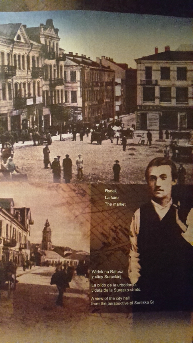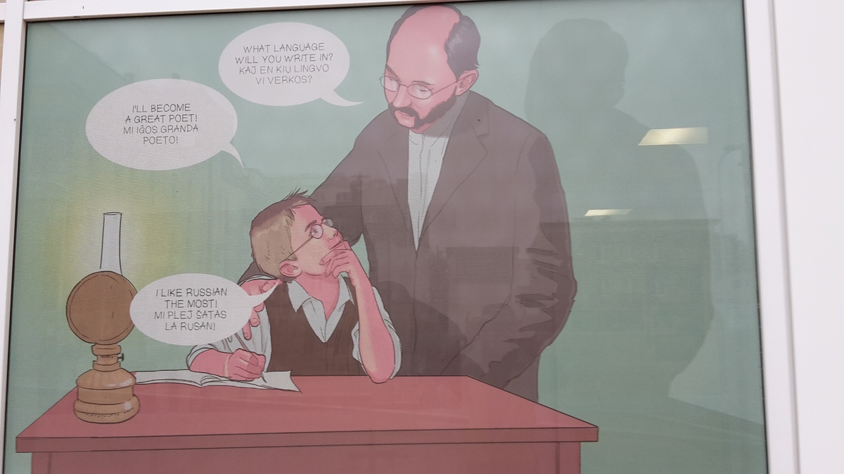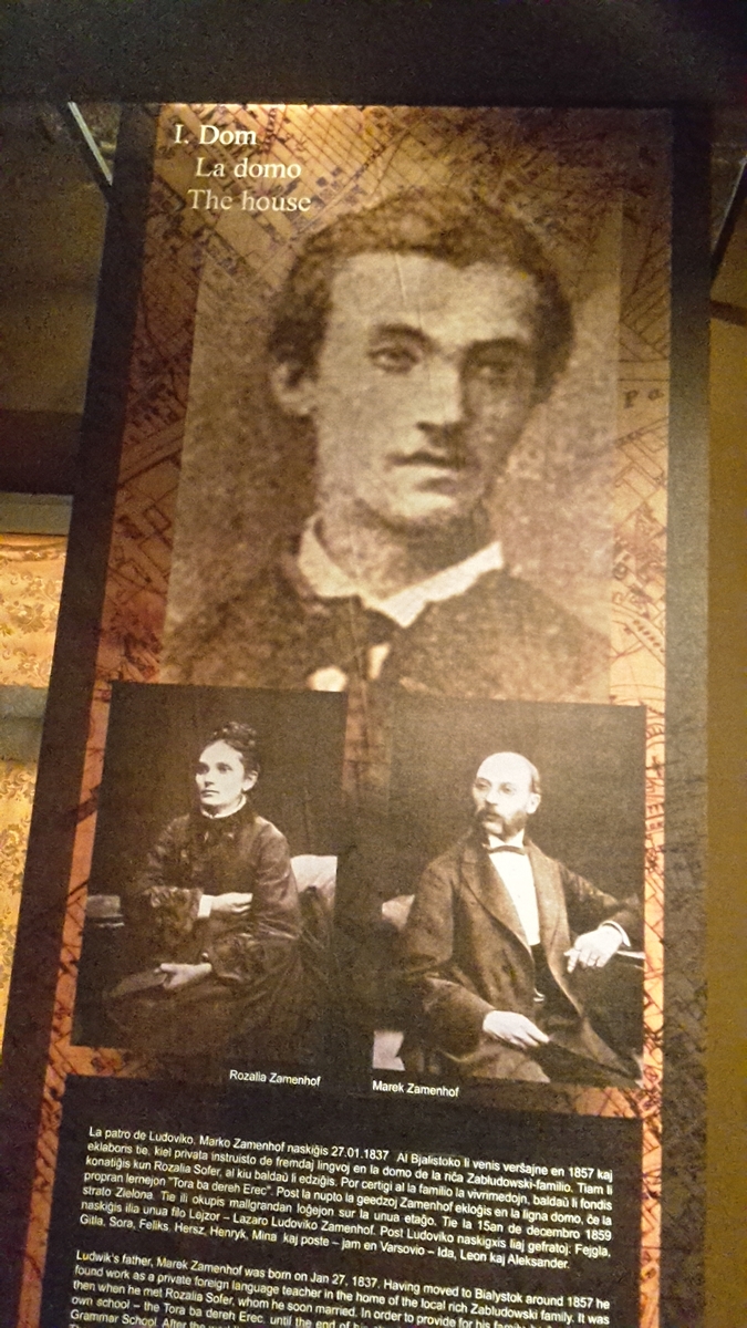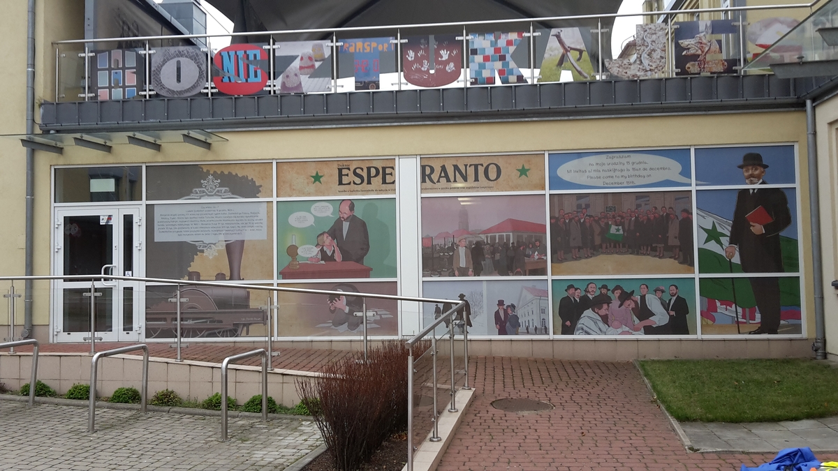 ![]() ![]() 15/09/2017 > 21/09/2017 - Białystok : Au cœur de la ville, le centre Zamenhof présente une excellente exposition sur les jeunes années de Ludovik Zamenhof. On y voit en particulier les deux seules photos de lui jeune (les photos coûtaient cher, au 19e siècle), ainsi que de ses parents et de la ville à l'époque. Sur une des façade, voici la traduction en français d'un dialogue de Ludovik avec son père Markus : Ludovic : Je serai un grand poëte. Markus : Dans quelle langue écriras-tu ? Ludovik : J'aime tout particulièrement le russe. À savoir que bien qu'il ne fut jamais linguiste, mais médecin, il maîtrisait le russe, le polonais, l’allemand, l’hébreu et le yiddish et avait aussi des notions dans six autres langues, dont le français. En la koro de la urbo, la Zamenhof-centro prezentas bonegan ekspozicion pri la juneco de Zamenhof. Precipe, videblas la du solaj fotoj pri li juna (fotoj multekostis en la 19a jarcento), same kiel pri liaj gepatroj kaj pri la tiama urbo. Sur fasado, fresko ankaŭ prezentas dialogon de Ludoviko kun sia patro. |