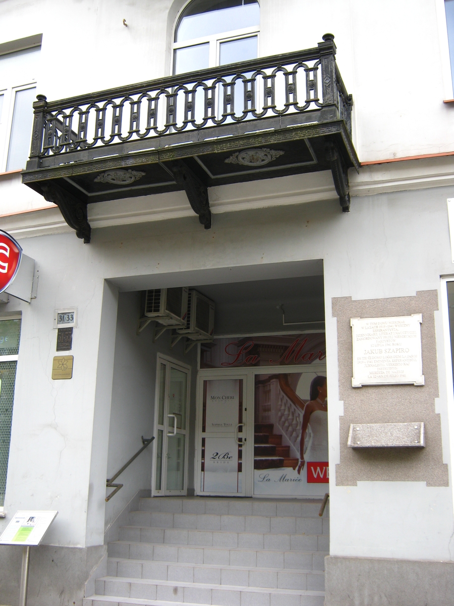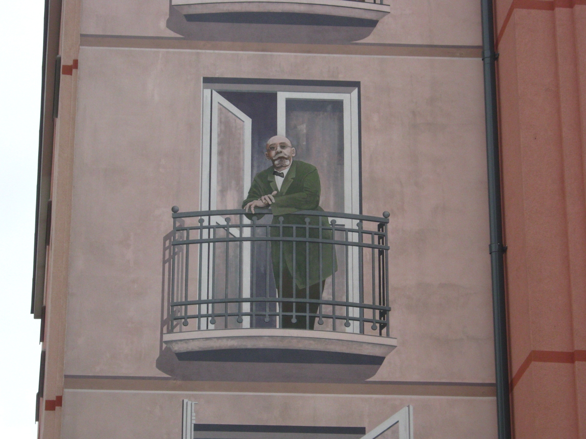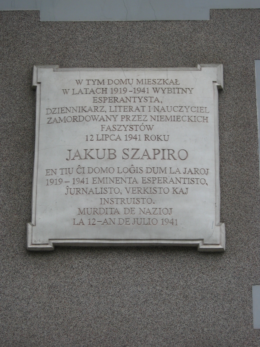 ![]() ![]() 15/09/2017 > 21/09/2017 - Białystok : Au numéro 6 de Zielona Ulica (Rue Verte) se trouvait la maison natale et d'enfance de Zamenhof. En 1919, la rue prit le nom du créateur de l'espéranto. En 1953 la maison fut détruite et, aujourd'hui, on peut y voir un immeuble moderne avec une fresque murale montrant Zamenhof au balcon du 2e étage, des espérantistes des années 1930 au 1er, et une famille d'aujourd'hui au 3e. Je la numero 6 de Zielona Ulica (Verda Strato) troviĝis la domo, kie naskiĝis kaj infanaĝe vivis Zamenhof. En 1919 la straton on renomis laŭ la nomo de la kreinto de Esperanto. En 1953 estis detruita la domo kaj, nuntempe, staras moderna domego kun mura fresko, kiu montras Zamenhof-n sur balkono de la 2a etaĝo, esperantistojn de la 1930aj jaroj je la 1a, kaj hodiaŭan familion je la 3a. |