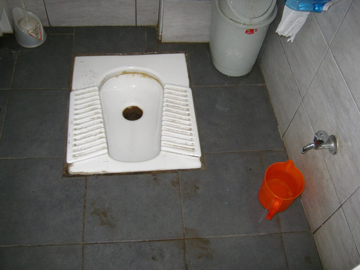 Turkio : Les fameuses toilettes à la turque ont tendance à disparaître pour être remplacées par celles avec siège et chasse d'eau. En plus d'un mois et demi dans le pays, nous n'en verrons guère plus d'une dizaine. La famaj turkecaj necesejoj pli kaj pli estas anstataŭataj de tiuj kun seĝo kaj akvopelilo. En pli ol unu monato kaj duono en la lando, ni vidos apenaŭ pli ol dek kelkaj da ili. |