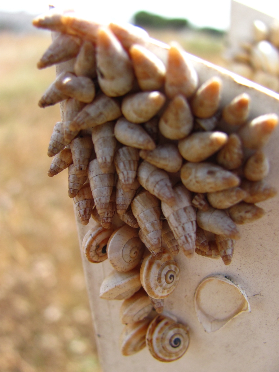 mini-escargots ont colonisé les branches des arbustes et les poteaux le