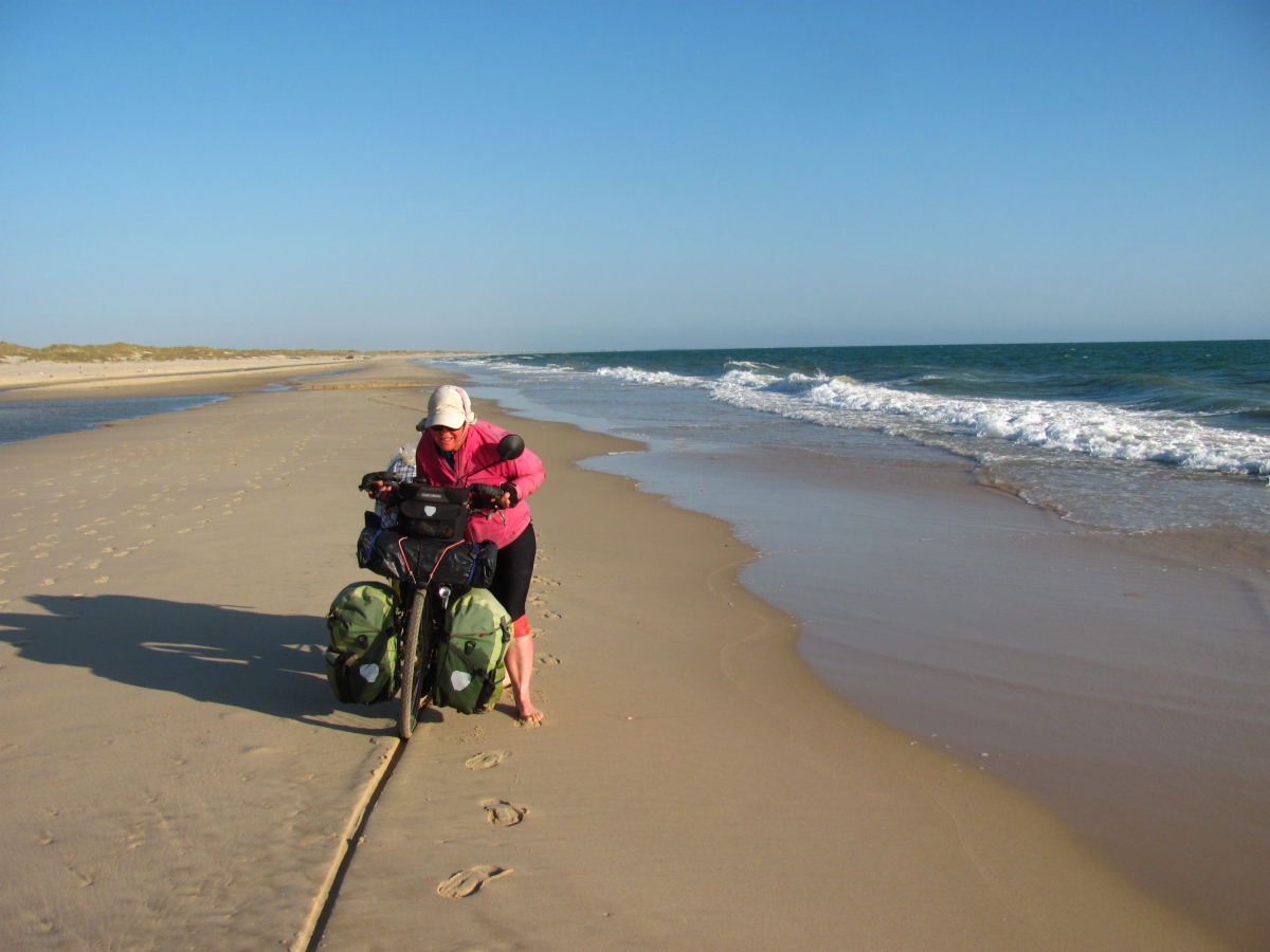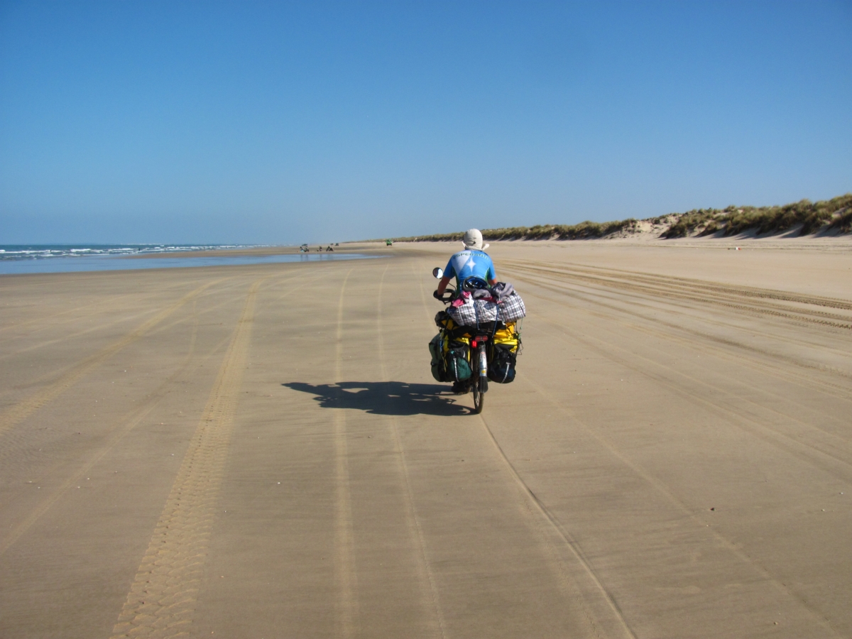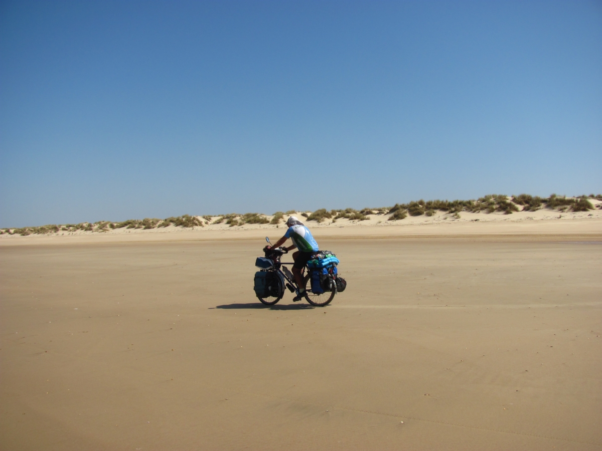 Eĉ sen vojoj, eblas laŭbicikli la marbordon je malalta tajdo, kiam la