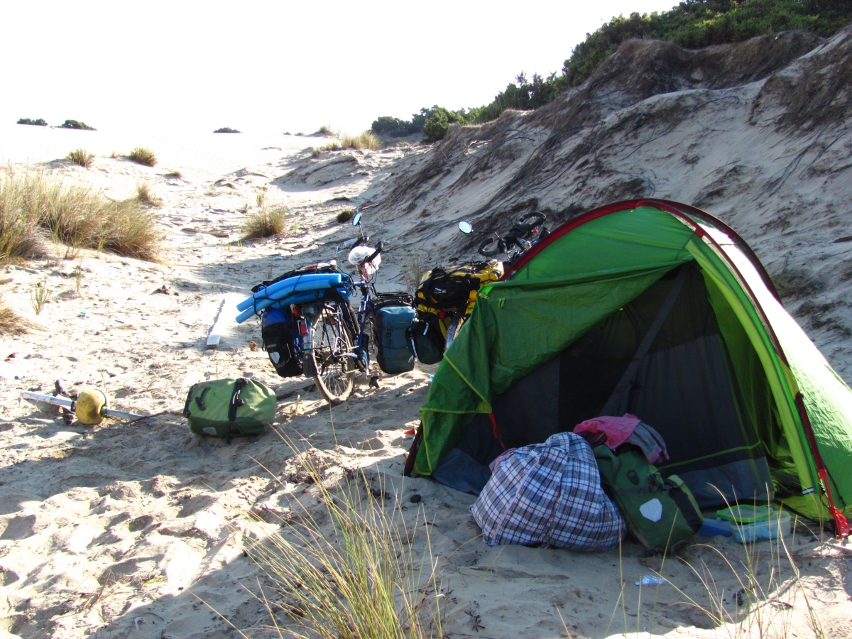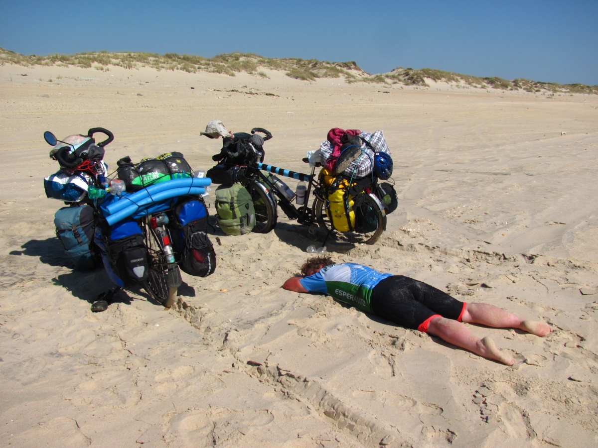 penege puŝi niajn 50-kilogramajn biciklojn, kiuj senĉese ensabliĝas.